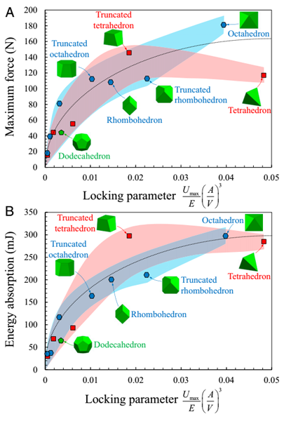 可用于预测(A)最大力和(B)能量吸收。这种方法可以有效地预测其他设计的性能,而无需实验或昂贵的计算模型。 着色区域的宽度代表实验结果的变化。