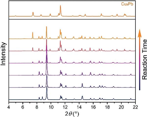 在15.7(2) GPa (λ= 0.406626Å)下加热铜和铅元素的混合物时所收集的原位PXRD数据。为便于比较,每条谱线已扣除背景。在15.7(2)GPa下Cu3Pb的计算所得Rietveld精修结构列于图上部。