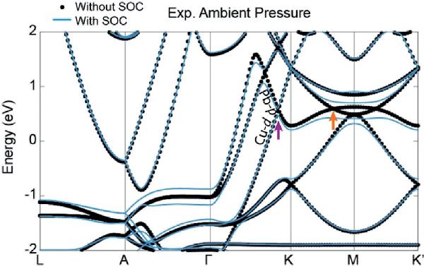 有(线)/无(点线)自旋-轨道耦合的Cu3Pb电子能带结构(环境压力下的实验结构)。 紫色箭头表示节点,橙色箭头表示约0.5eV的节点环。费米能级设定为0 eV。