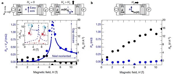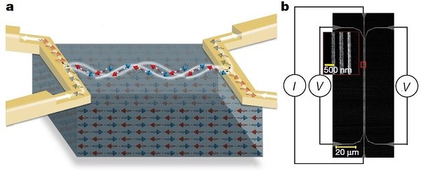 自旋电子学是基于自旋输运的新兴科学技术。所谓自旋其实是电子的内禀角动量,与质量、电荷一样是电子自身固有性质。电子自旋输运被认为与传统电子器件中电子电荷输运相类似,也可作为载体用于信息传输,根据自旋转移这一特性设计开发的新型电子器件可有望作为现有电子器件的升级替代产品。类似于电流,通过自旋霍尔效应电子发生特定的偏转,从而产生自旋流(Spin current)。自旋流作为自旋信息传输的核心,是发展基于自旋计算器件的关键。近年来,研究人员发现在铁磁绝缘体中可通过温度梯度驱动自旋的定向运动,从而产生自旋流及其长程输运(Long-distance transport)现象。相较于铁磁绝缘体,反铁磁性有序材料具有零净磁矩的特点,是应用于自旋电子学器件的理想材料。然而,反铁磁体中自旋输运现象的直接观测目前只限于几个纳米的范围,严重制约了相关材料的发展。