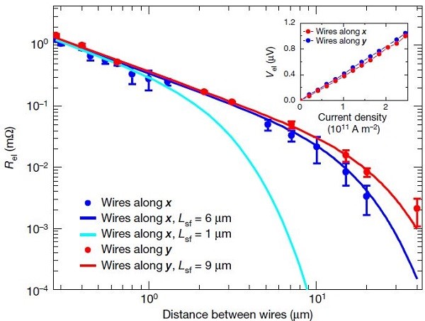 近日,德国美因茨大学的R. Lebrun以及M. Klaui(共同通讯作者)等人在反铁磁绝缘体赤铁矿(α-Fe2O3)单晶中利用自旋霍尔效应展示了自旋流的长程传播行为。首先研究人员将电流通过赤铁矿单晶上的铂丝,一方面可以引发自旋霍尔效应产生横向自旋流,驱动自旋在铂-赤铁矿界面累积,这一累积富集过程能够进一步产生带有净角动量的自旋流。另一方面,通过铂丝的电流还能使得铂丝产生焦耳热引发横向温度梯度变化,从而可根据自旋塞贝克效应产生自旋流。这两种自旋流及其自旋电压最终共同构成了非本地电压(non-local voltage),可通过逆自旋霍尔效应进行检测。基于以上策略,研究人员通过计算测量发现赤铁矿这一简单反铁磁绝缘体传输自旋信息的距离可达到微米级别,与复杂铁磁体一样高效。2018年9月12日,相关成果以题为“Tunable long-distance spin transport in a crystalline antiferromagnetic iron oxide”在线发表在Nature上。