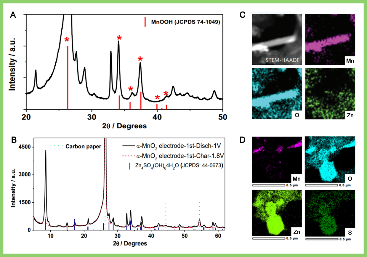 (A)α-MnO2放电到1V时的XRD图谱,表明形成了MnOOH相;