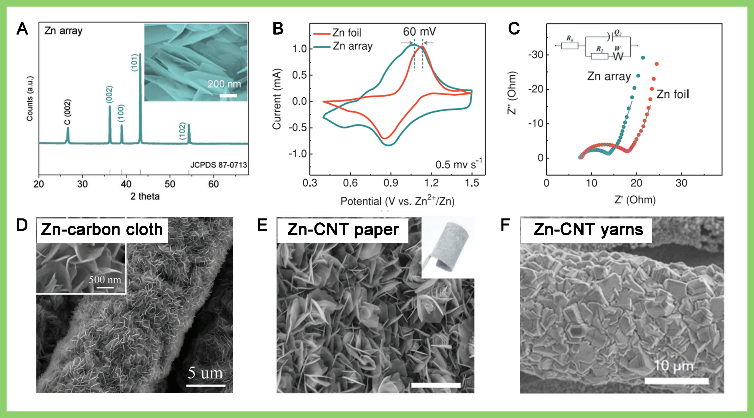 (D, E, F)Zn纳米片-碳布,Zn纳米片-碳纳米管纸,Zn纳米颗粒-碳纳米管线复合负极材料。