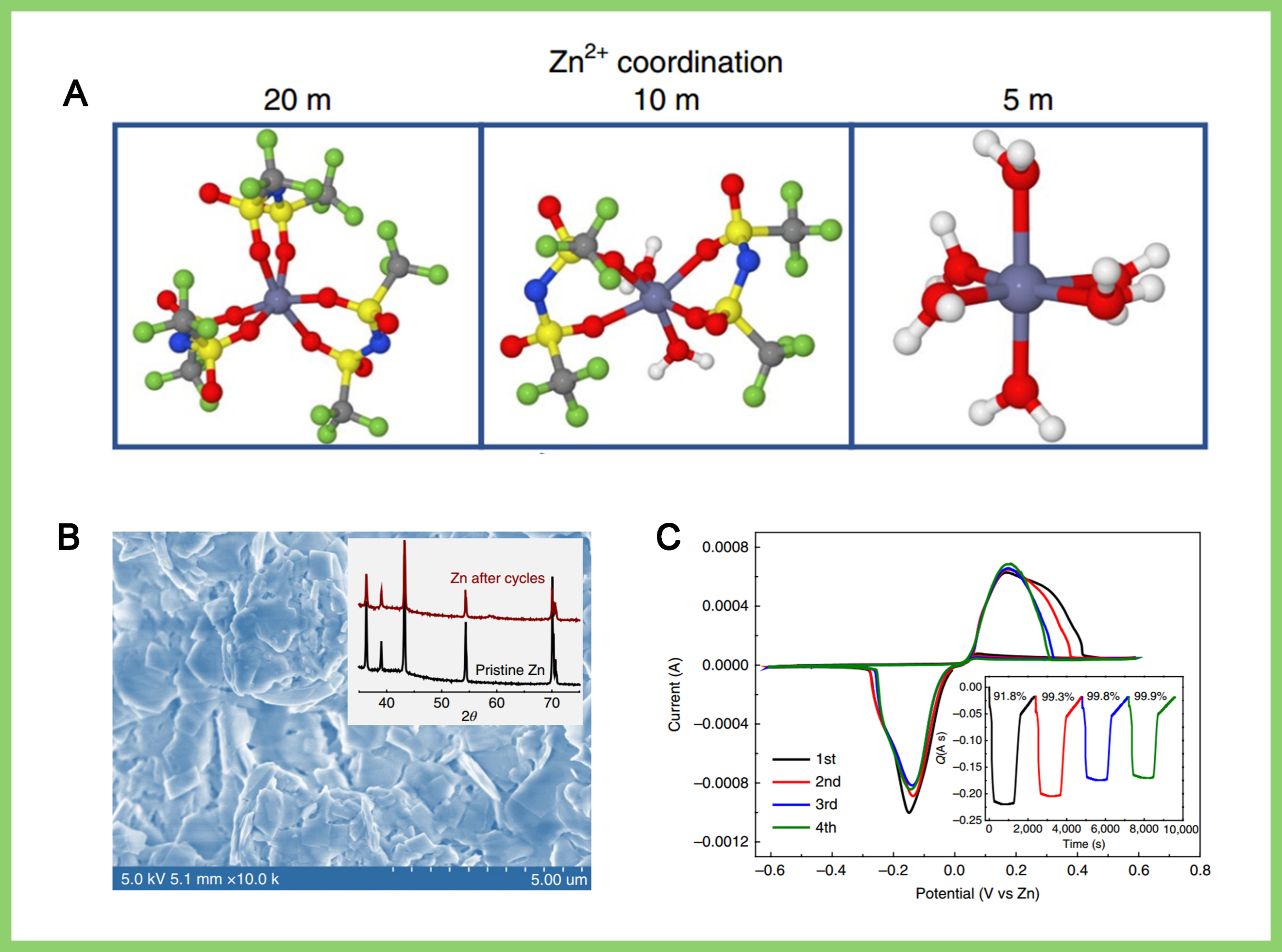 (A)在1M Zn(TFSI)2及三种不同浓度LiTFSI (5 M, 10 M和20 M)电解液中典型的Zn2+-溶剂化结构;