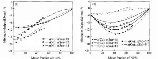 图4 Cu-Ni-Sn三元系中液相在1580K时的混合焓的计算结果与实验值[3]