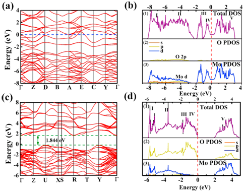 (b)计算的1)MoO2的总态密度2)O和3)Mo元素的分波态密度结果表示。