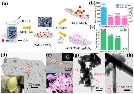 (h)GMCN的TEM形态,GMCN的C,N,Mo和N元素的EDS能谱。
