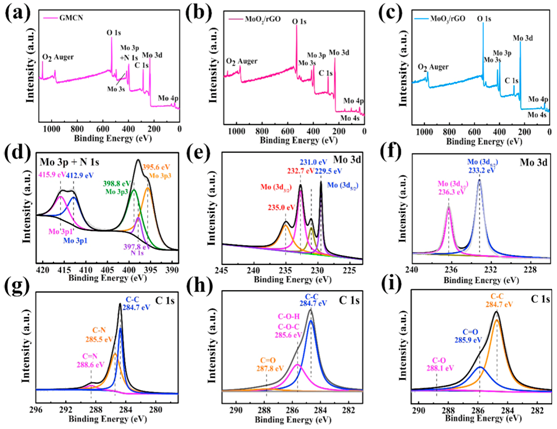 (c)GM3样品的XPS光谱及其(f)Mo 3d和(i)C 1s的XPS高分辨率能量区域。