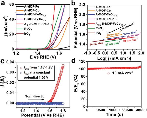 近日,中山大学苏成勇教授、李光琴教授(共同通讯作者)等通过金属、对苯二甲酸(A)和2-氨基对苯二甲酸配体(B)的组装制备了异质金属-有机框架(MOF)(记为A2.7B-MOF-FeCo1.6),其具有优异的电催化OER活性,并在Adv. Energy Mater.上发表了题为“Modulating Electronic Structure of Metal-Organic Framework for Efficient Electrocatalytic Oxygen Evolution”的研究论文。上述MOF在10 mA·cm-2下具有288 mV的超低过电势以及39 mV·dec-1的Tafel斜率。优越的电催化OER性能应归功于通过金属节点和连接体的调控对MOF中本征催化中心的电子结构优化。该工作不仅为纯MOF在电催化中的应用提供了参考,而且还提供了一种通过调控MOF中催化活性中心的电子结构来提高电催化性能的有效策略。