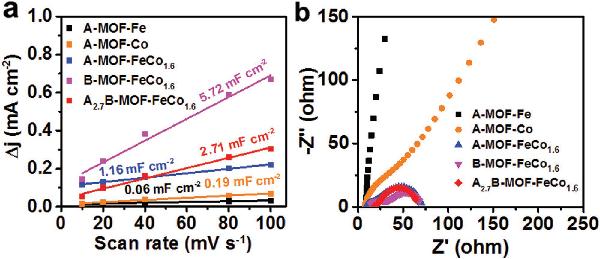 a) A-MOF-Fe(Co)、A(B)-MOF-FeCo1.6和A2.7B-MOF-FeCo1.6的Cdl测试;