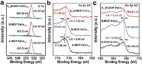 a) A(B)-MOF-FeCo1.6和A2.7B-MOF-FeCo1.6的O 1s XPS光谱;
