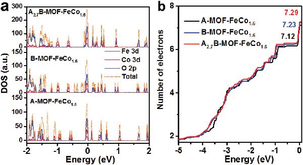 a) A(B)-MOF-FeCo1.6和A2.7B-MOF-FeCo1.6的DOS计算;