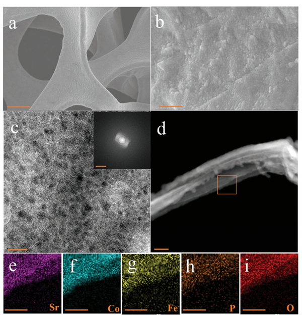 a,b)比例尺分别为20和200nm。无定形SCFP样品的TEM图像。c,d)比例尺分别为10和200nm。图(c)的插图是无定形SCFP样品的SAED图案(比例尺为51nm-1)。e-i)无定形SCFP样品的EDX图像(比例尺为50nm)。