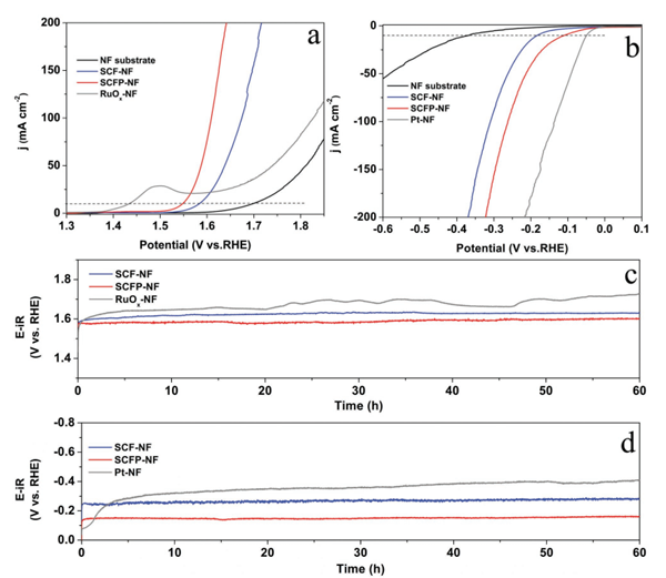 a)NF底物,SCF-NF,SCFP-NF和RuOx-NF样品的OER活性。b)NF底物,SCF-NF,SCFP-NF和Pt-NF样品的HER活性。c,d)SCER-NF和对照样品对OER(c)和HER(d)的稳定性试验。