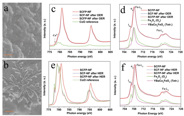 a,b)在OER(a)和HER(b)之后,在10和-10mA cm-2的电流密度下2分钟的SCFP-NF的SEM图像。比例尺分别为200nm和1μm。c,d)在OER的第一个LSV之前和之后的Co(c)和Fe(d)的XAS光谱。e,f)在HER的第一个LSV之前和之后的Co(e)和Fe(f)的XAS光谱。