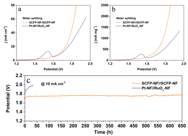 a)几何区域活动和b)双功能SCFP-NF催化剂和Pt-NF偶联RuOx-NF催化剂的水分解的质量活性。c)在10mA cm-2的恒定电流密度下的水分解的稳定性试验。