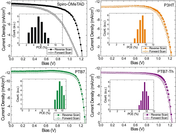 在这个工作中,作者在室温大气条件下制备了可溶液加工的FTO/TiO2/CsPbI3量子点/HTM/MoO3/Ag太阳能电池。利用传统的共轭聚合物作为空穴传输层,在无需进行掺杂的条件下,基于钙钛矿量子点太阳能电池具有较高的器件效率和极低的能量损失。这个工作会为未来钙钛矿量子点在太阳能电池的器件结构设计和应用提供重要的实验路径。