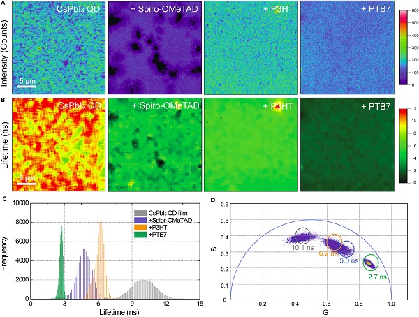 (b).CsPbI3量子点薄膜,和顶部有spiro-OMeTAD、P3HT、PTB7的CsPbI3量子点薄膜的寿命成像
