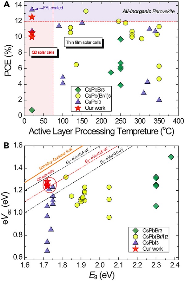 限制钙钛矿太阳能电池商业化进程的重要原因是其在环境中的不稳定性,比如MAPbI3可在水份的存在下分解成PbI2和CH3NHI3。为了解决这个问题,研究目光集中在更稳定的无机钙钛矿太阳能电池上,比如CsPbI3。立方CsPbI3的相转化温度高达350℃,当放置在外界环境中时,其会转化为正交晶相。许多种方法被开发用于稳定立方晶型,然而这些方法在溶液-薄膜的结晶过程中需要精确控制。近来,钙钛矿量子点太阳能电池在解决稳定的问题上吸引了广大的注意。