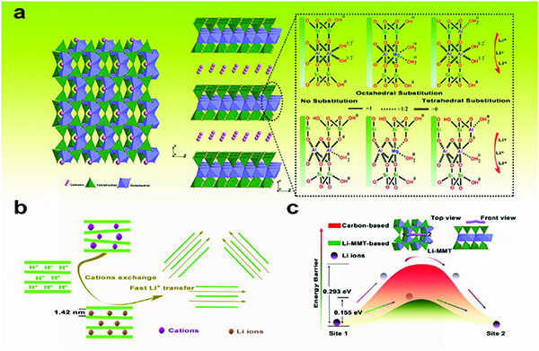 (c)Li离子扩散的能垒与Li-MMT的层间表面的示意图,其远低于碳基电极中的扩散势垒