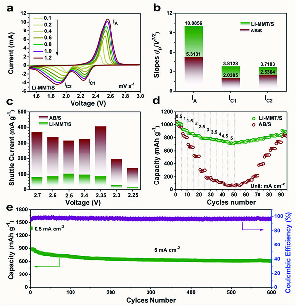 (c)AB/S和Li-MMT/S电极之间的穿梭电流与施加的恒电位充电电压的比较
