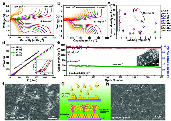 (c)硫负载量和电流密度之间的相关性以及文献中最近的相关报道