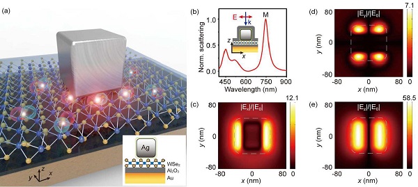 (a) NCOM系统的示意图,包括在超光滑金膜基底上的银纳米立方体,氧化铝、单层WSe2和银纳米立方表面的PVP将银纳米立方和金膜隔开;
