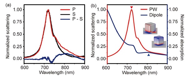 (a) 由P-(红色)和S-(黑色)偏振光激发的归一化暗场散射光谱,它们之间的差(蓝色)得到了800 nm处的峰;