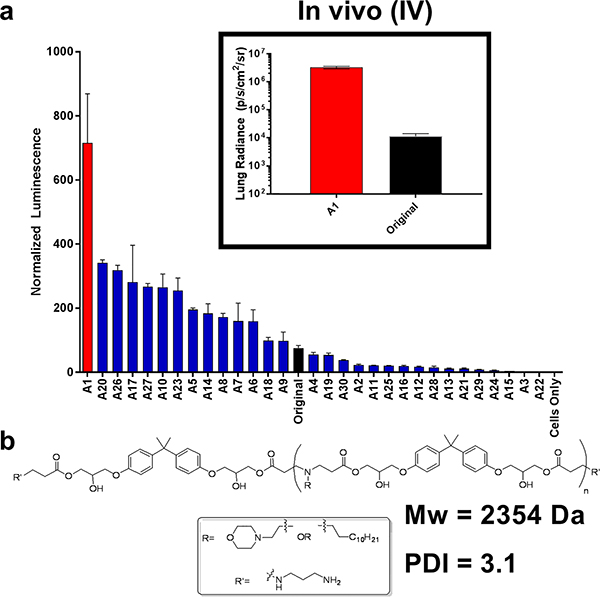 (a) 在Hela细胞中进行体外递送时,用于优化PBAE合成参数的部分因子筛选优化揭示了几种更加有效的聚合物;