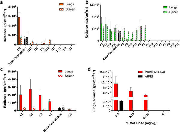 (b) 部分因子筛选在肺部具有更多有效的配方,而在脾中几种制剂显示出高荧光素酶信号;
