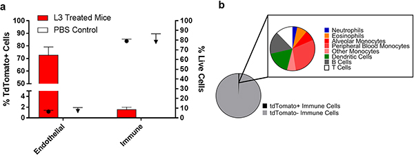 (a) 细胞类型的百分比为TdTomato +(条形图,左轴),表明使用A1-L3纳米颗粒成功转染Cre mRNA;