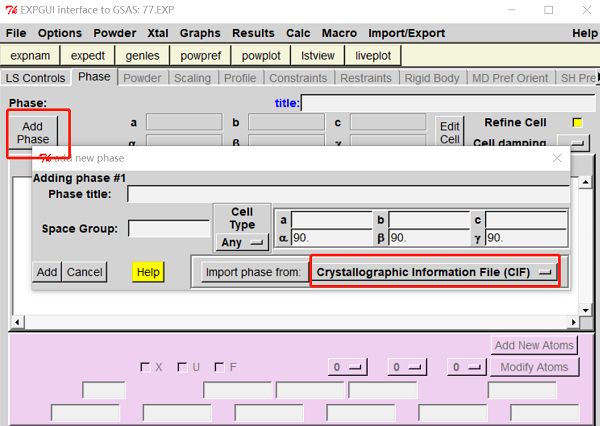 (2)“Phase”中点击“Add Phase”,弹出框中点击选择“CIF”,打开相应的 .cif 文件,点击“Add”导入数据(图4)。