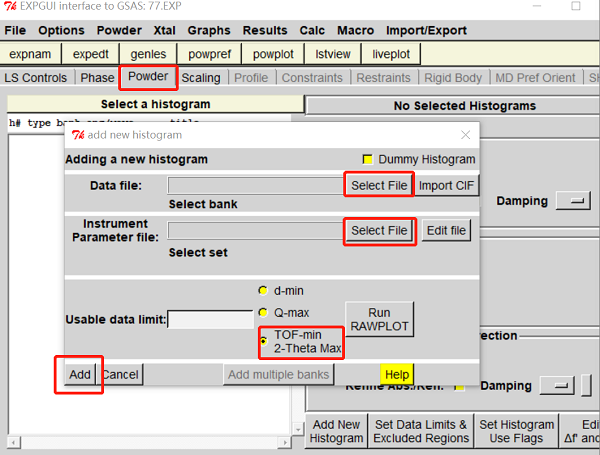 (3)“Powder”中点击“Add New Histogram”,选择相应的 .gsas 和 .inst 文件,最下边选择“2-Theta Max”,点击“Add”(图5)。
