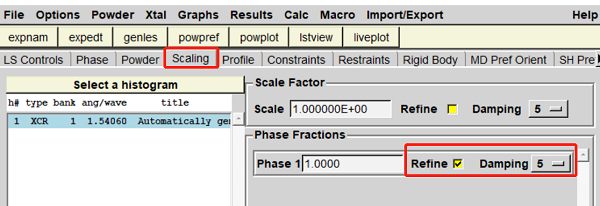 (5)“Scaling”下“Scale”后的“Refine”一般不勾选,“Phase Fractions”后的“Refine”可一直勾选运行,所有需要精修的参数它后面的“Damping”一般都选择5(图7)。