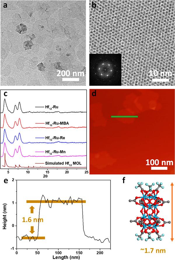 Hf12-Ru通过单羧酸交换合成Hf12-Ru-M (M = Re或Mn)的示意图及其日光驱动CO2还原。