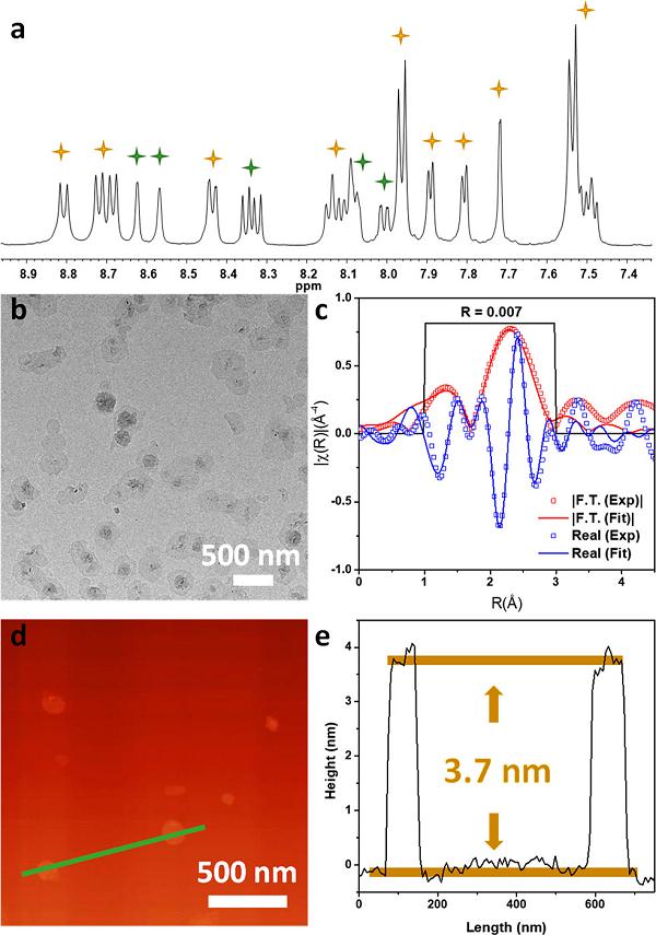 a) 消解后Hf12-Ru-MBA的NMR光谱,黄色和绿色星号分别归属于L-Ru配体和MBA配体;