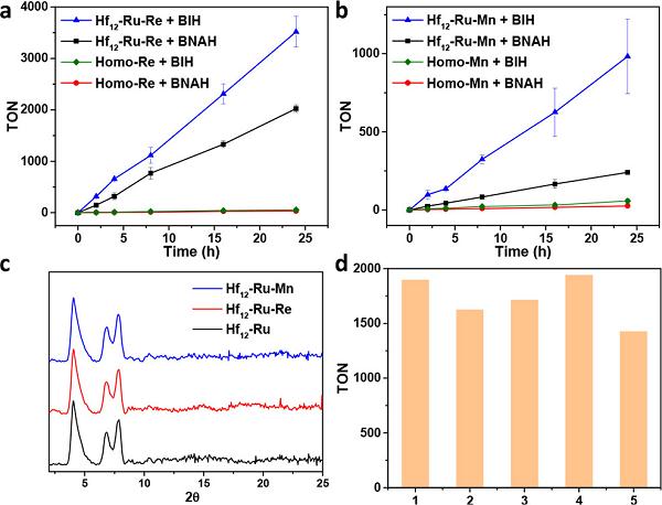 d) Hf12-Ru-Re连续5次循环的CO产生转化数。
