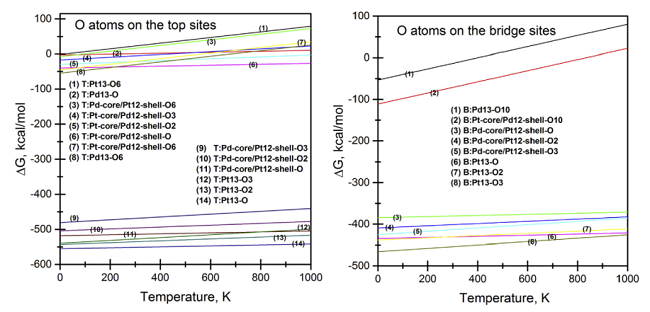 图8、9为相应的计算结果,对完整催化过程的阐述需要动力学模型支撑,原子热力学计算纳米团簇的吉布斯自由能和预测气相环境中最低能量结构的方法是研究不同压力和温度下多相催化系统的一种有效的方法。