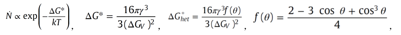 经典热力学理论讨论特定的 “孤立” 系统,对材料设计和改善提供定性理论指导。几十年来,基于经典热力学的相变形核理论一直是合金开发的基础,例如,利用形核理论来选择合适的微合金化元素,以此来改善基体的机械性能。形核理论最初由 Volmer 、 Weber 等人在气相研究中提出,Turnbull 、Fisher将其应用到凝聚系统的均质形核,后来引入f(θ)函数修正后扩展到异质形核,该理论包括: