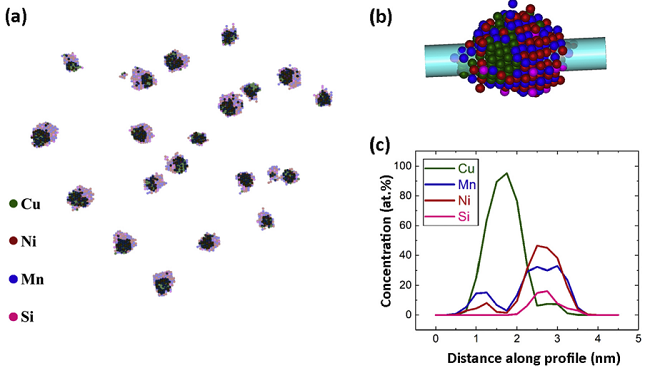 (a)KLMC模拟简图,(b)Cu-MnNiSi析出放大图,(c)ROI沿z轴的一维浓度分布