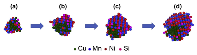 图8、9为KLMC模拟结果和析出相的演变机制,可以看出,首先在Cu原子团簇外面形成一层MnNiSi,接着形核、有序化,并近一步长大。对FeCuMnNiSi合金的模拟研究发现,界面能、有序能和扩散激活路径之间的相互作用决定了共沉淀形貌,动力学路径对于理解多组元成分系统中的共沉淀过程和设计微观组织提供了指导意义。
