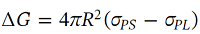 其中,N 为形核率,γ 为界面能,θ 为润湿角,ΔGV 为单位体积自由能差,ΔGV 只与固、液相的摩尔自由能有关,但在实际溶液中由于过量自由能的存在使得它对大多数合金不适用, Youdelis 等人研究得出,对于正规溶液模型,当过冷度 ΔT 较小时,ΔGV ≈ – ΔSV ΔT, ΔSV 是系统的熵变, ΔS=ΔSF+ΔSM,