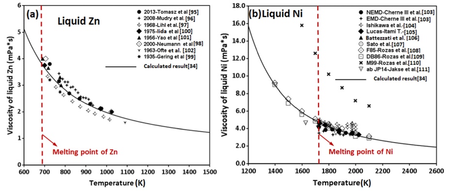 图5 纯Zn、Ni熔体的粘度随温度的变化曲线(基于CALPHAD的计算值和部分试验值)