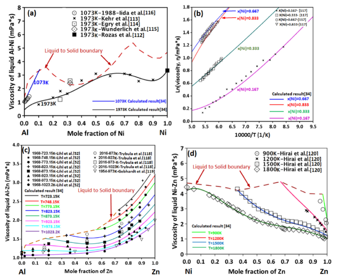 例如,Renhai Shi,Alan A. Luo等人为了在Al-Ni-Zn金属基复合材料(MMCs,Metal-Matrix Composites)中获得均匀的陶瓷增强相,首先需要在熔化过程中陶瓷增强组织均匀弥散地分布在液相中,其次,在凝固过程中利用凝固前沿捕获颗粒或纤维组织,但在多组元合金中,关于凝固前沿与陶瓷增强组织之间相互作用的研究还比较缺乏,为此,他们分别对纯Zn、Ni溶体和二元系溶体的粘度进行了计算机模拟,结果如图5、6所示,计算的粘度值满足Arrhenius定律,并且与试验值相吻合[2]。