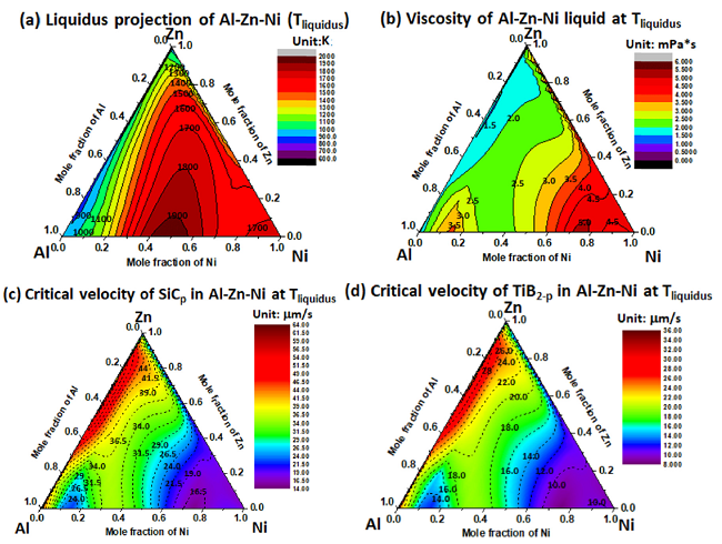 (a)Al-Ni-Zn三元系统的液相线投影,(b)液相线温度下Al-Ni-Zn三元系的粘度计算值,(c)、(d)分别为Al-Ni-Zn熔体凝固前沿的SiCp、TiB2-p(r = 50nm)的临界速度