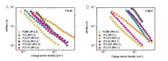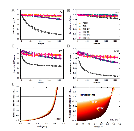 该工作中的太阳能电池由程序控制自动进行稳定性测试。测试条件为干燥氮气氛围(氧气和水含量均小于0.5ppm)使用白光LED灯照射,期间温度控制在30 °C。结果显示(图二),ITIC分子结构调控对电池稳定性影响极大。其中,端基氟化的ITIC-2F和侧链以苯环取代噻吩环的ITIC-Th表现出较好的稳定性,与此相反,ITIC和端基为单个甲基的ITIC-M表现出持续的短路电流和填充因子衰减,而端基有两个甲基的ITIC-DM在起初几百个小时以内即有很强的短路电流和填充因子衰减。作者分析了稳定性最好的PCBM、ITIC-2F和ITIC-Th三个体系的T80寿命,结果表明,按照德国南部日平均太阳高峰时段3.3小时来计算,基于ITIC-2F的体系预期使用寿命可接近10年。