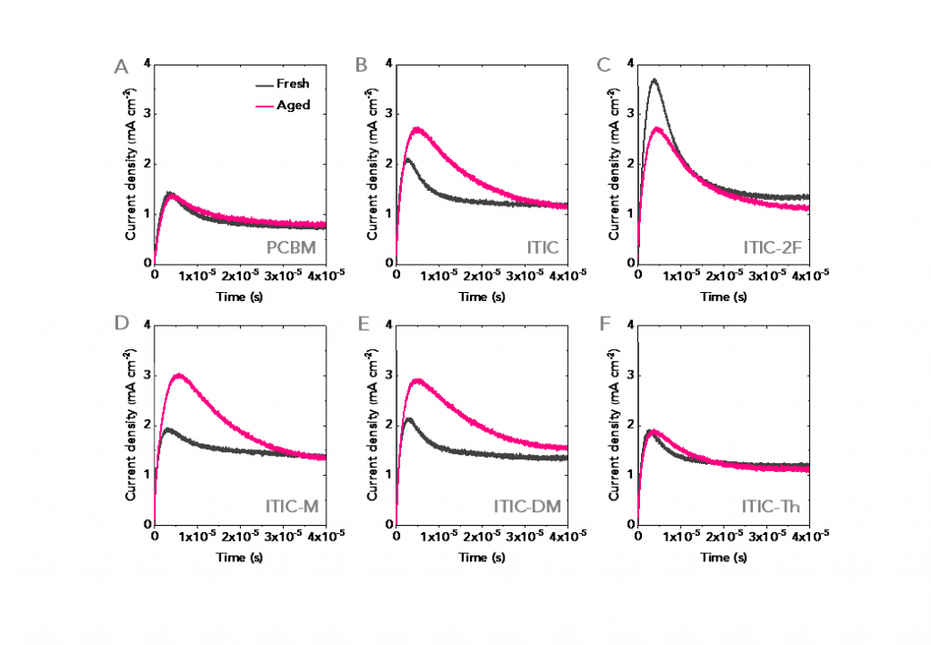作者通过进一步的瞬态光电压谱(TPV)和载流子瞬态抽取测试 (CE)(图三)揭示了衰减器件中缺陷相关的载流子复合损耗增加。光照线性增压载流子瞬态法(Photo-CELIV)(图四)测试进一步说明缺陷态增加导致载流子迁移率下降。为深入理解缺陷态产生的机制,作者研究了仅基于受体材料的电子传输器件在相同白光照射下的稳定性。结果表明,基于ITIC-2F和ITIC-Th的电子传输器件非常稳定,而基于ITIC-M和ITIC-DM的器件则迅速衰减,这一结果与相应的太阳能电池的稳定性表现出相同的趋势,说明太阳能电池的稳定性与光照下受体的稳定性相关。傅里叶变换红外光谱测试(FTIR)证明了ITIC-DM在光照下发生共轭健的断裂,而光致发光测试(PL)的荧光淬灭也同样证明了光照下缺陷态的产生。