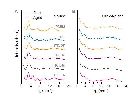 随后,作者对活性层形貌进行了详细研究(图五)。结果发现,基于ITIC的活性层结晶态部分在光照下发生结晶取向的改变,而对于端基和侧链修饰的ITIC衍生物其结晶部分形貌相对稳定。掠入射小角X射线散射测试(GISAXS)(见原文)则揭示了ITIC-DM在光照下有明显的聚集态增加,结合电致发光的测试结果,作者确认了非晶态共混相形貌的改变也同时影响了ITIC-DM器件的快速衰减。