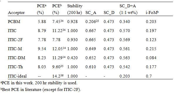 表一. The calculation of industrial Figure of Merit (i-FoM) based on the power conversion efficiency (PCE), stability and synthetic complexity (SC) for the investigated material systems.