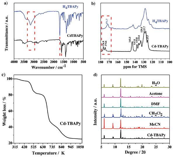 a)傅里叶变换红外光谱;b)固体13C核磁共振谱;c)Cd-TBAPy的热重分析;d)Cd-TBAPy浸泡在不同的溶剂中12h后的XRD图谱。